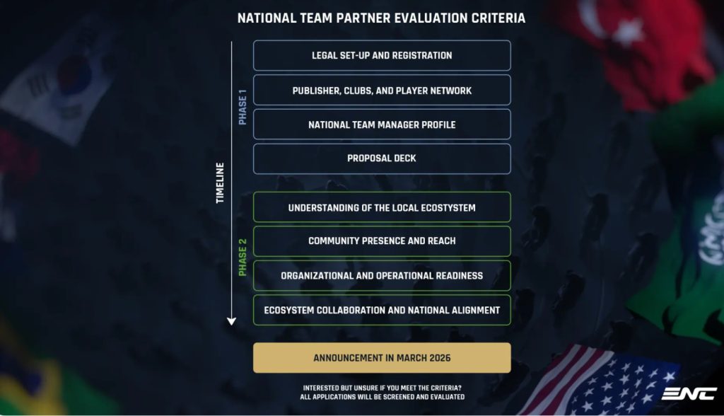 Each partner can nominate a National Team Manager, who will act as the main link between EWCF and the local ecosystem. Importantly, EWCF will compensate this role with up to $25,000 per ENC season, recognising the time and responsibility involved.